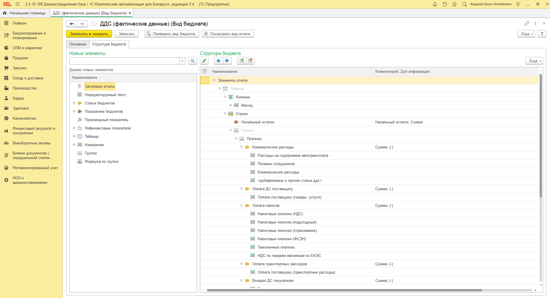 - Бюджетирование: решение задач финансового планирования — формирование бюджетов движения денежных средств (ДДС) и бюджета доходов и расходов (БДР), формирование различных статей бюджетов, сценариев бюджетов, видов бюджетов, план-фактный анализ деятельности предприятия в разрезе видов бюджетов, сценариев и статей.