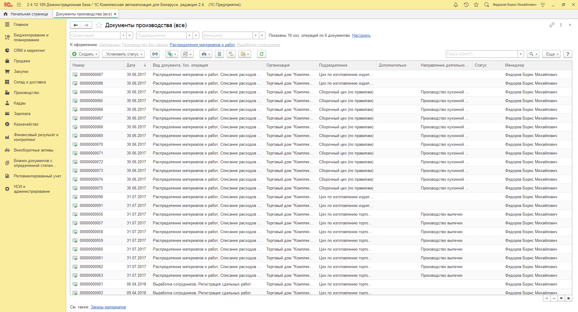 - Управление производством: ведение «упрощенного» учета производства, позволяющее без применения сложных механизмов обеспечить учет производственных процессов с этапа передачи материалов в производство до выпуска готовой продукции. Формирование полной производственной себестоимости изделий и работ в разрезе статей калькуляции. Давальческая схема производства с привлечением внешнего переработчика — передача сырья переработчикам.