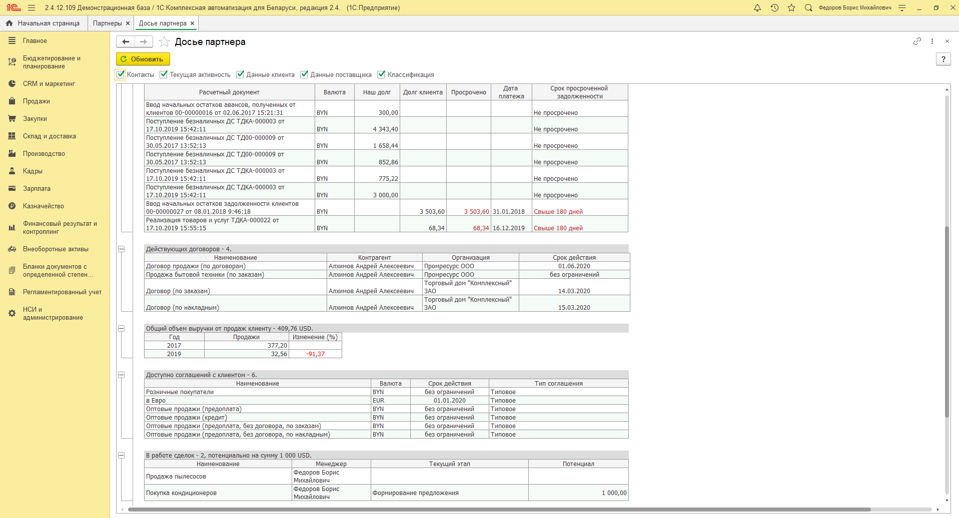 - Управление правилами продаж: использование договоров, типовых и индивидуальных соглашений с клиентами; регистрация и контроль ценовых, финансовых, объемно-календарных условий продаж; запрет отгрузки клиентам по произвольным условиям (в том числе и при наличии просроченной дебиторской задолженности).